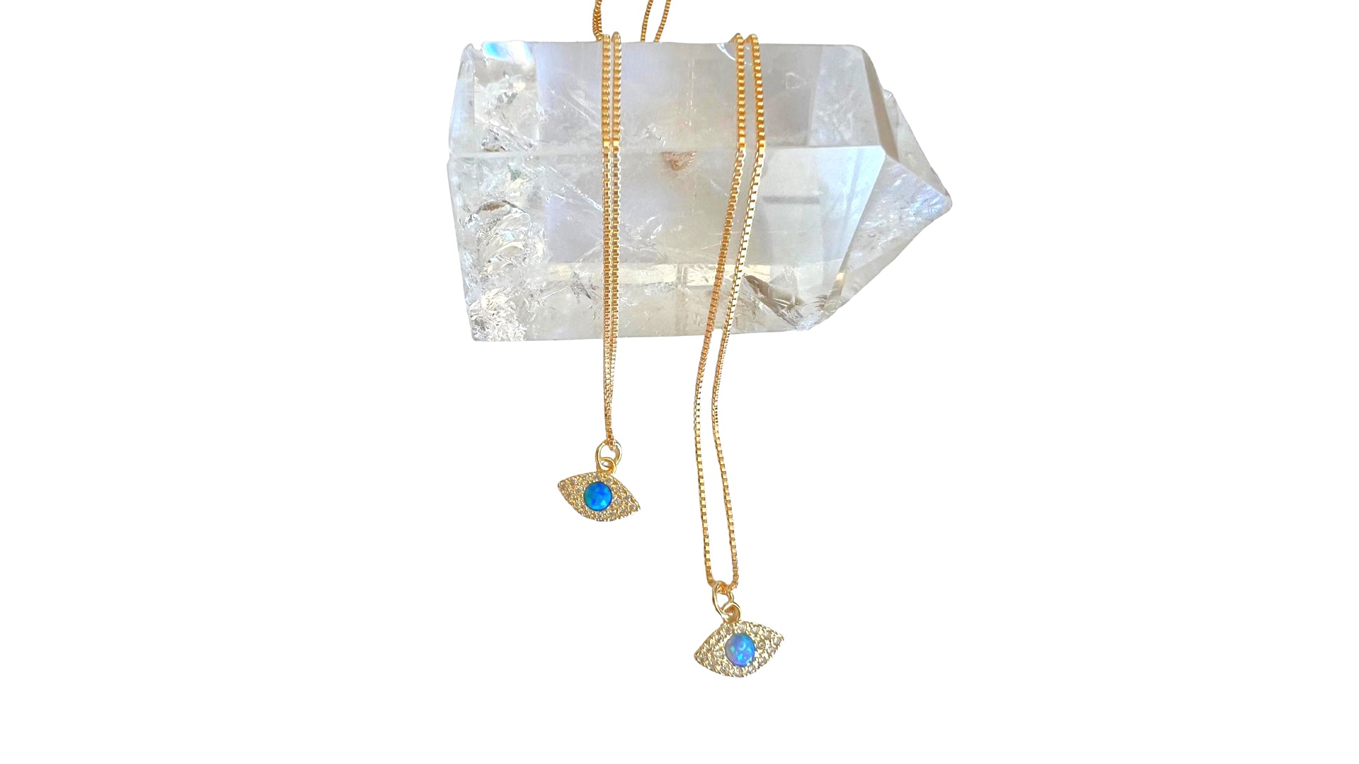 18kt gold plated opal & cz Evil eye charm on a 14kt gold filled 16” cable chain.
